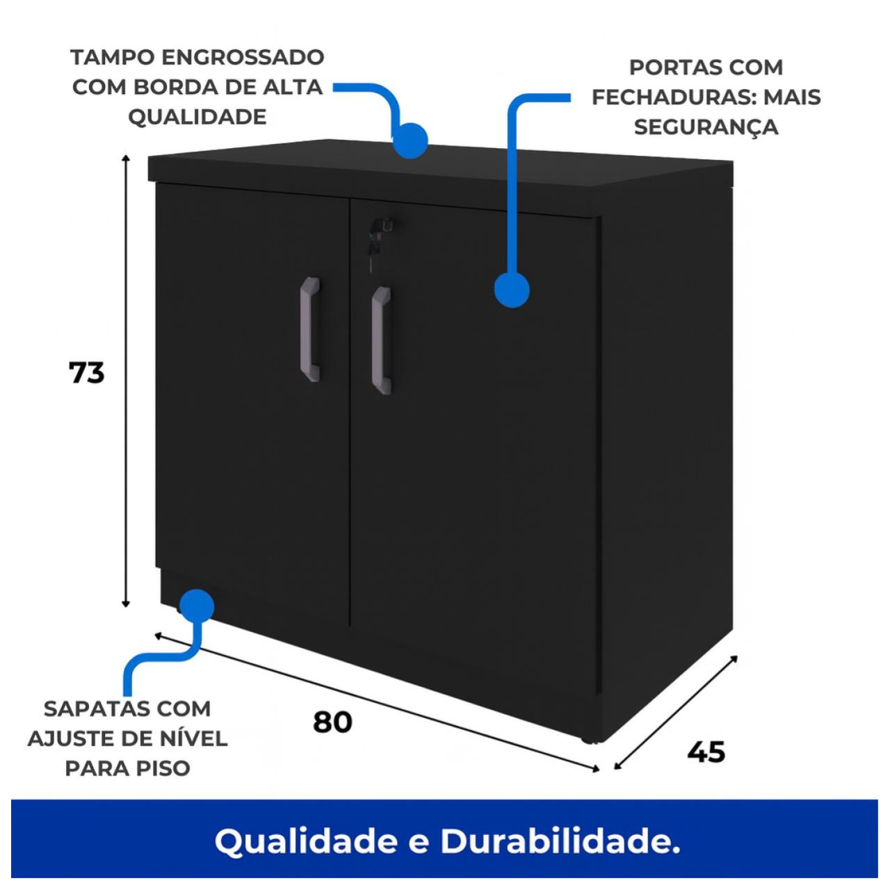 Design moderno e funcional, com portas seguras e tampo resistente para apoio de objetos.