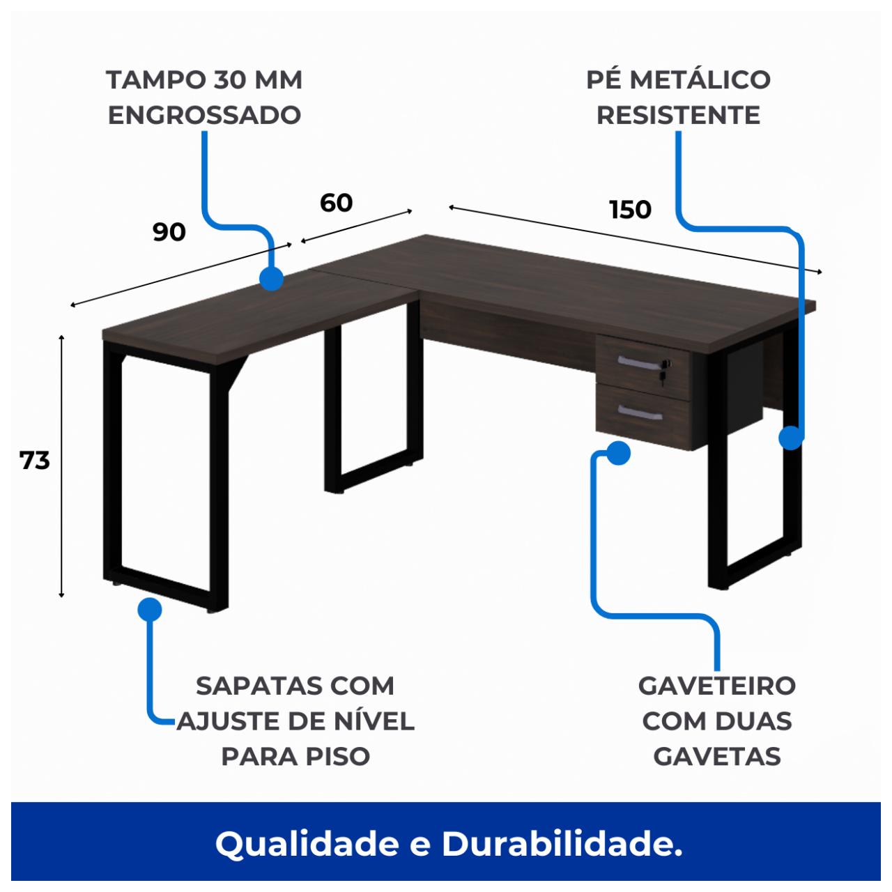 Mesa em L (1,50×0,60m + Mesa Auxiliar) – C/ Gavetas MARSALA/PRETO – 25477