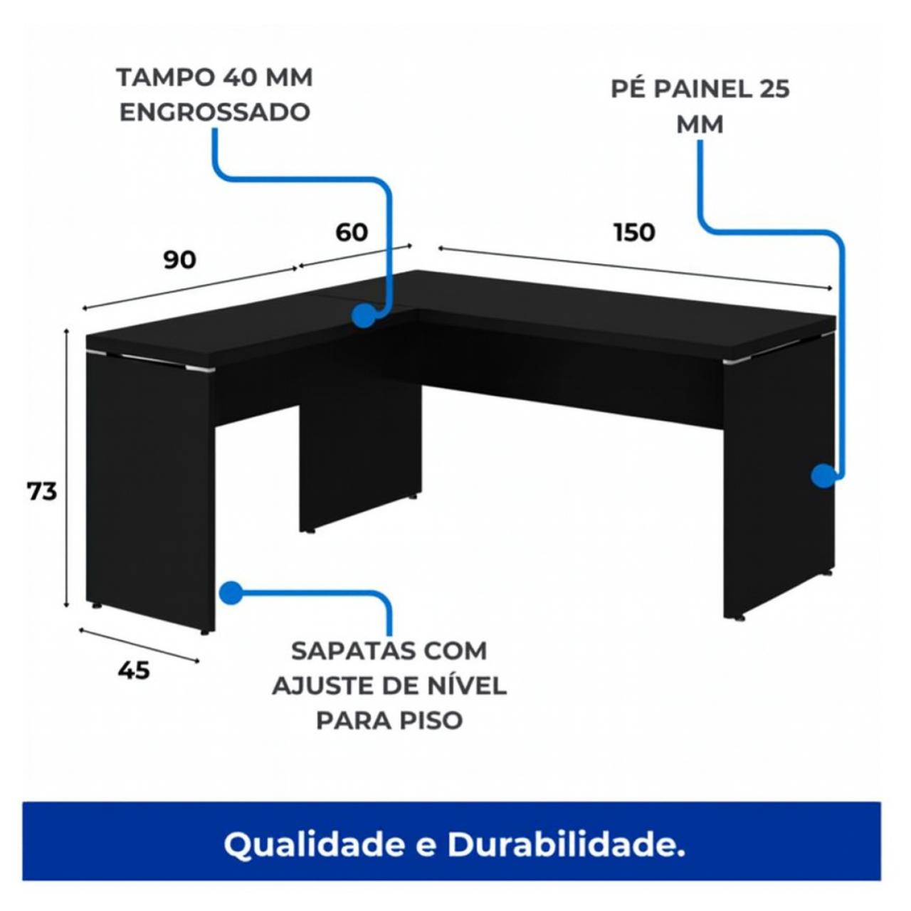 Mesa em formato L, ideal para escritórios, home offices e ambientes corporativos que necessitam de amplo espaço de trabalho. Estrutura robusta em MDP de alta resistência, com design moderno e acabamento fosco na cor preta.