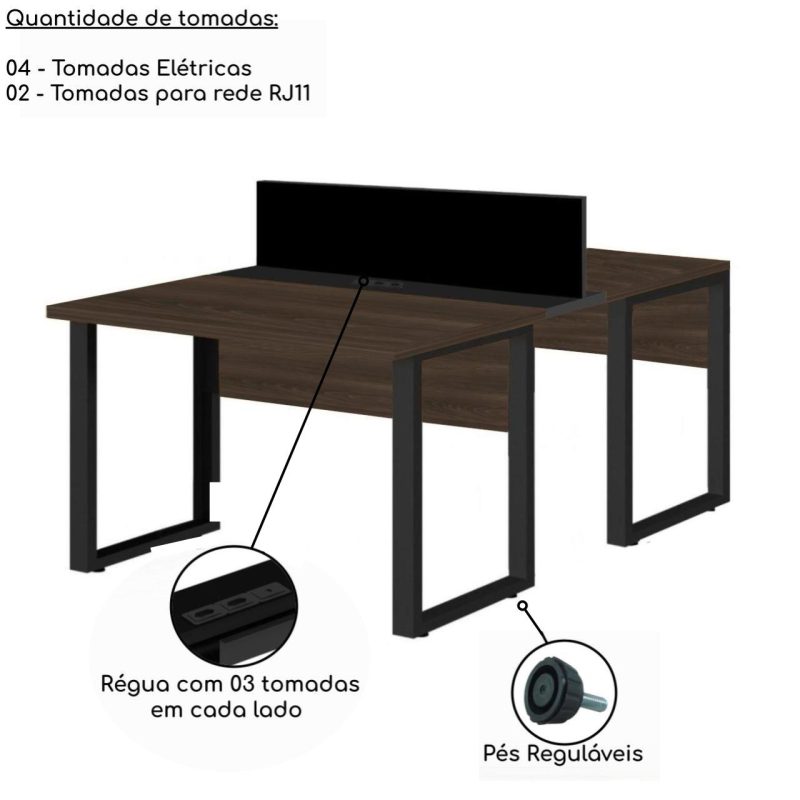 Mesa Estação de Trabalho Dupla 1,50×1,35m 2 Lugares s/ Gavetas c/ ponto de tomada PÉ QUADRO MARSALA/PRETO – 64002